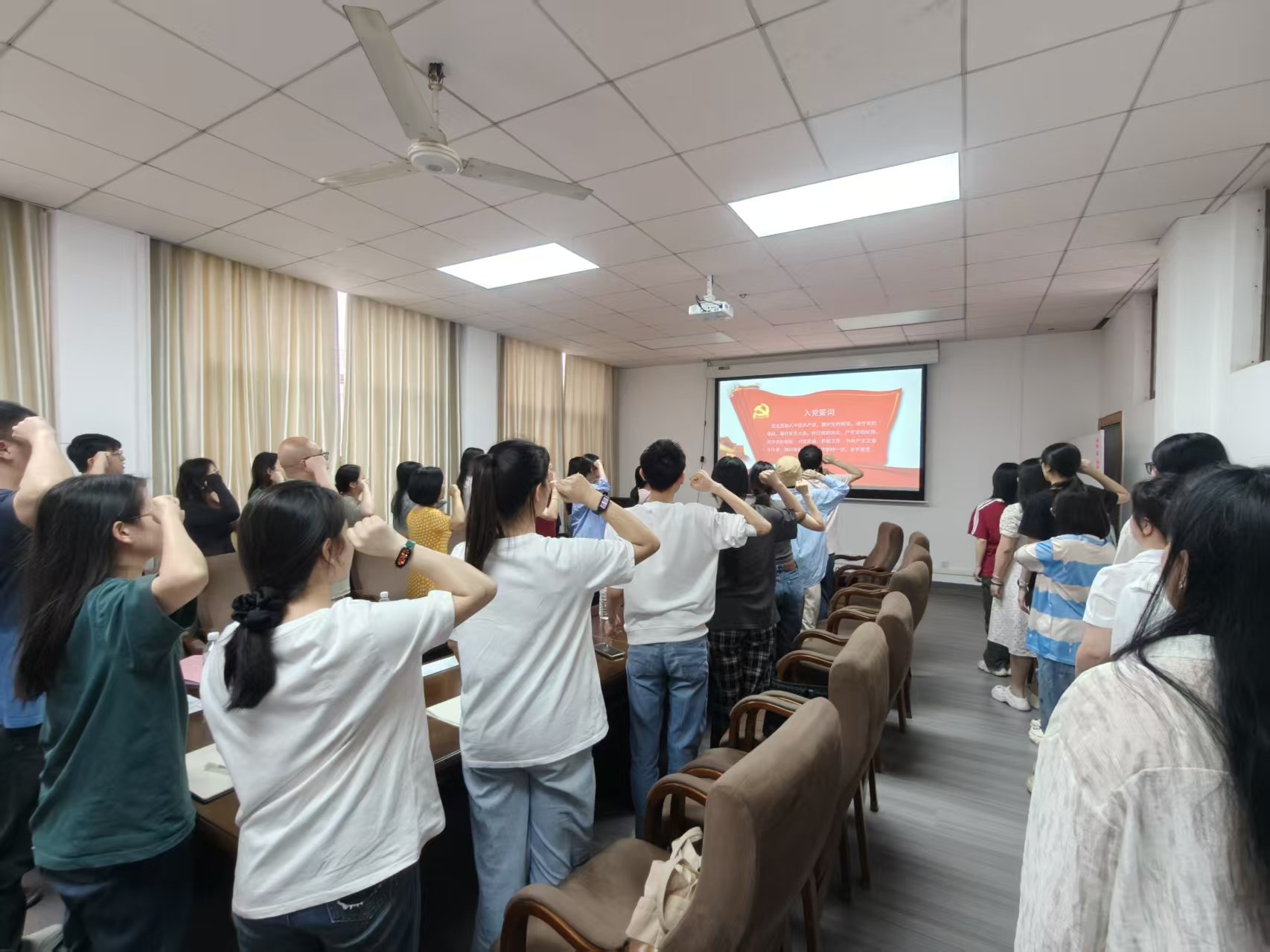 在领誓人吴骏杰同志的带领下,党员们举起右拳,庄严宣誓:“我志愿加入中国共产党,拥护党的纲领,遵守党的章程……”通过重温入党誓词,毕业生党员表达了对党的无限忠诚和为共产主义事业奋斗终身的坚定决心。