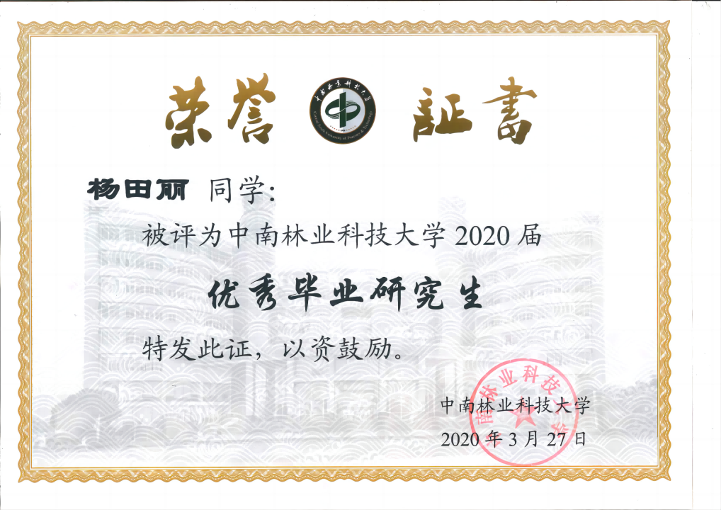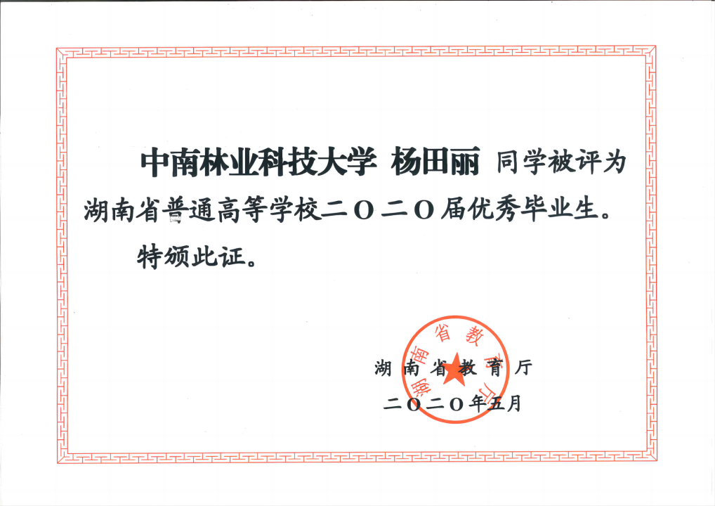 杨田丽同学荣获湖南省普通高等学校二〇二〇届优秀毕业生,英国威廉集团官网2020届优秀毕业研究生,指导教师为化学党支部王文磊老师