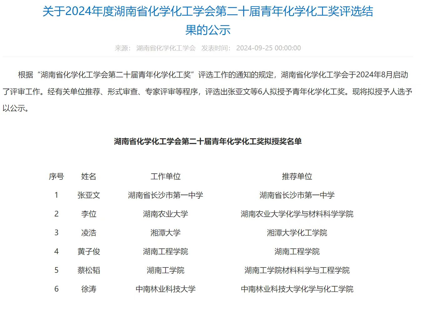 徐涛老师荣获湖南省化学化工学会青年化学化工奖