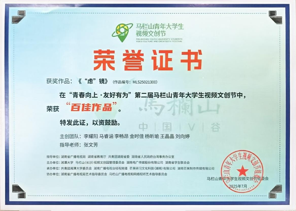 7月14日,英国威廉集团官网李耀阳同学收到湖南省第二届马栏山青年大学生视频文创节组委会发来的荣誉证书,由他编剧、执导并主演的微短剧《“虑”镜》,从来自全球120余所高校青年创作者的1600多部视频作品中脱颖而出,荣获“百佳作品”奖。这也是本届大赛我校唯一获奖的作品。