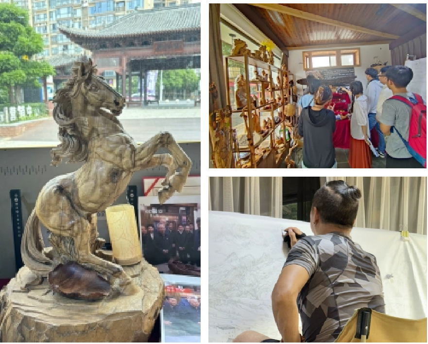 7月17日上午10:30,团队成员来到了河街内的巨型木雕(湘行散记)创作基地,了解了木雕制作的过程,“潘氏艺术木雕”传承人潘能辉老师精心打磨每一个细节的精神令人惊叹,仅一方木头、一把刻刀,便能造就精美绝伦的作品。
