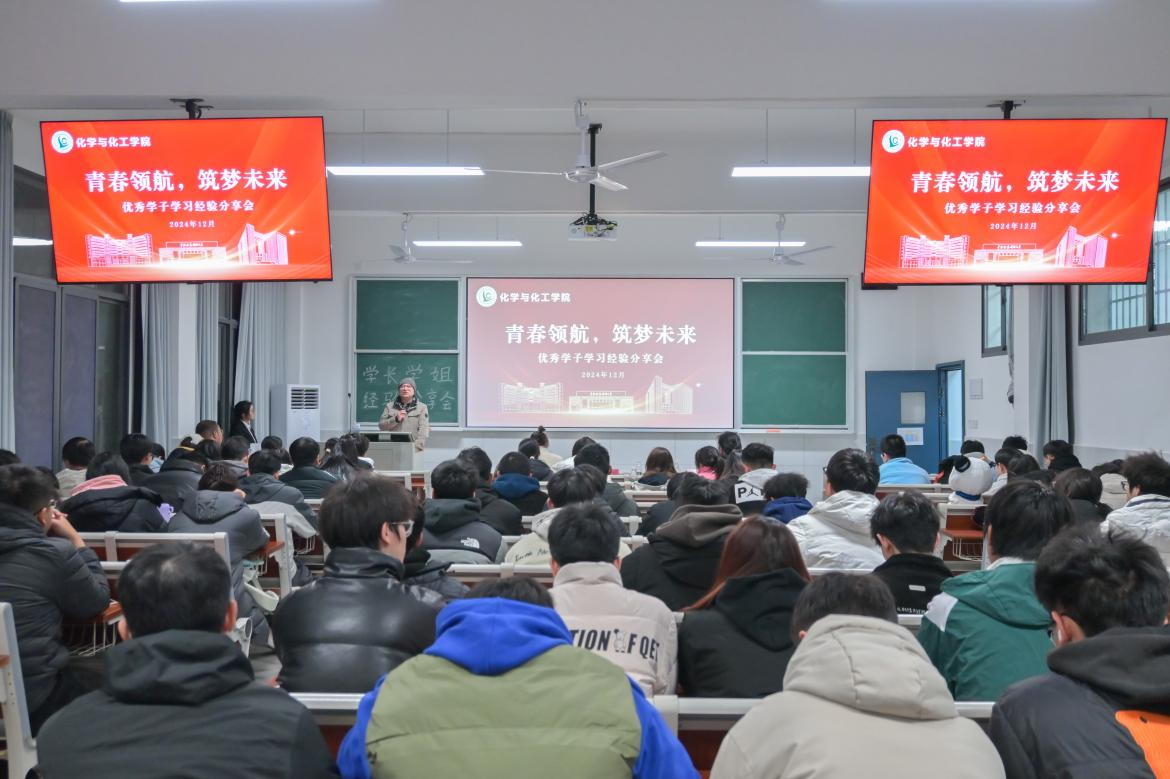 为发挥学院优秀学子的榜样示范作用,引导同学们树立正确的学习态度,掌握高效的学习方法,实现自身全面发展。12月19日晚19点,化学与化工学院于经世楼201开展“化语‘青’音——第一期优秀学子经验分享会”。本期的主讲嘉宾是学院2023-2024学年国家奖学金获得者陈荣康和保研优秀学子易欣柔,学院全体辅导员,2022、2023、2024级部分学生参加此次分享会。活动由学院创新创业部成员梁雨涵主持。
