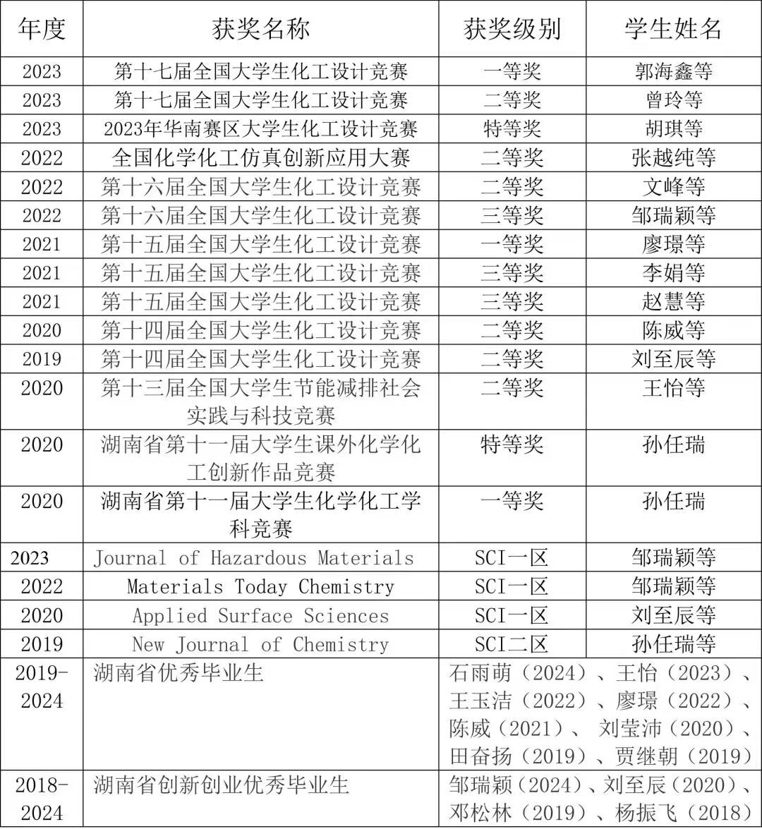 本专业教师教学理论与实验实践结合紧密、形式多样、内容丰富,着重培养学生团队意识、人文素养和创新精神,教学科研成果丰硕,为学生的创新创业实践提供了有力支撑,在全国大学生化工设计竞赛、全国大学生节能减排社会实践与科技竞赛、大学生数学建模竞赛和“挑战杯”、“互联网+”大学生课外学术科技作品竞赛中获得大奖,主持了多项全国和湖南省大学生创新创业实践项目。培养学生具有团队意识、人文素养和创新精神,并与中国石化、兴发化工集团、久瑞生物、广东华林化工、天龙精细化工、天地恒一制药等单位建立了实习基地,为学生的实践提供了有力支撑。